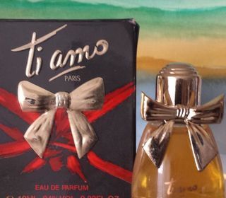 MINIATURE EAU DE PARFUM 10ML "TI AMO" flacon transparent, sérigraphié doré, bouchon n?ud doré .