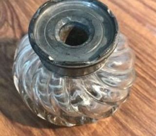 Encrier en verre et métal Fin XIX° siècle Les bords du bouchon en métal sont concaves , ce qui permet de poser le porte plume sur le bouchon et d'éviter qu'il ne tombe
