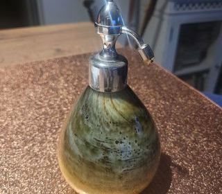 Après partage , vends un vaporisateur de parfum signé Marcel Franck en pâte de verre brune de 15 cm de haut et 8 cm de diamètre . Manque la poire . 45 Euros . Egalement une lampe B