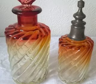 Lot de 2 flacons en cristal de baccarat - modèle bambou non signé : - 1 flacon avec bouchon et corps torsadés (modèle bambou) - couleurs dégradées: rouge rose translucide - dim. E