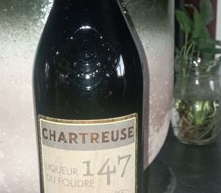 Une authentique bouteille de liqueur du monastère de la grande Chartreuse, la Liqueur du Foudre 147. La Cuvée du Foudre 147 est une liqueur d'assemblage. Pour créer cette liqu