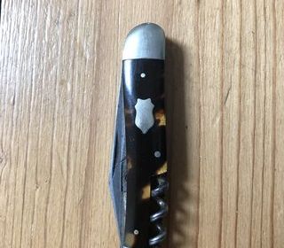 Couteau multifonction pliant avec manche effet écaille et embouts métalliques, comprenant notamment une lame et un tire-bouchon intégrés.