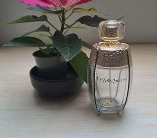 Bouteille de parfum en verre transparent avec bouchon décoratif. Marque clairement indiquée sur le devant. Contenu partiellement utilisé, visible à travers le verre.