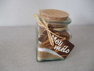 Bocal en verre avec bouchon liège, contenant du sucre MELI MELO, hauteur 10cm chaque côtes 7cm, n'a jamais été ouvert (pouvant être utilisé comme cadeau de noël) NEUF