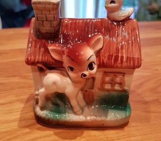 Tirelire en céramique peinte à la main des années 60/70. La céramique est en très bon état, seul le bouchon d'époque pourrait être changé, mais il tient toujours en place. Dimensio