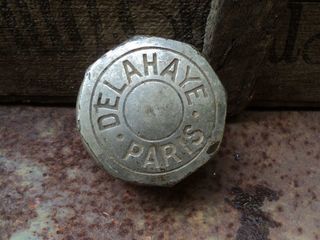 Ancien Bouchon de Radiateur ou Cache Écrou de Roue Delahaye. Hauteur 4,5cm, diamètre 8cm. État : Dans l'état , présence d'usure, intérieur à nettoyer
