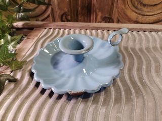 Ancien Bougeoir à Main Tôle Émail Bleu Ciel Diamètre 16cm, hauteur 4,5cm. Bon état, petits accidents