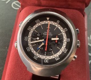 Oméga Flightmaster - Ref. 145.026 - Année 1970 Montre chronographe, mouvement mécanique. Cadran gris, index bâtons blancs luminescents peints, aiguilles bâtons blanches avec p