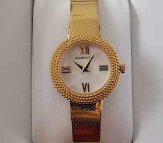 Montre dorée avec bracelet rigide a ressort avec cadran en nacre magnifique en excellent état ! Uniquement sur place et règlement en espèces.