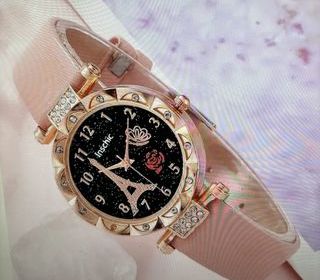 Montre bracelet rose et sa monture. SKU 1000C25 Prix : 19,09 € Théme de la Tour Effeil qui remporte un grand succés... Jolie montre au cadran noir et son bracelet blanc qu