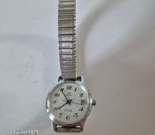 Petite montre femme avec date journalière, couleur argent, et bracelet élastique En parfait état de marche , la pile est neuve De marque Calvi quartz L