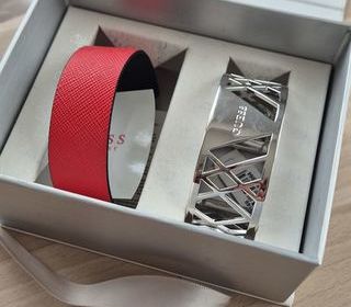 Très joli bracelet Guess neuf avec étiquette livré avec sa manchette en cuir interchangeable rouge et bleu marine. Reçu en cadeau dans un coffret avec la montre, le bracelet est ne