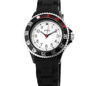 Montre 4you fond blanc à quartz pédagogique avec chiffres arabes et sont bracelet silicone de couleur noir , lunette rotative étanche 5 ATM MONTRE 4you de référence 250005002, C