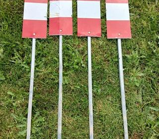 4 piquets de chantier en bon état : 110 cm ; face 38 cm x 15 cm...
