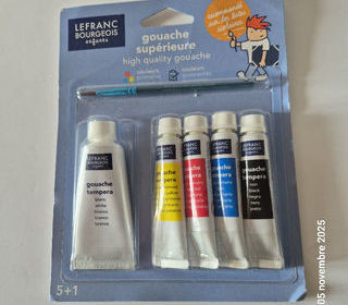 Gouache en tube Lefranc Bourgeois, set de 5 tubes assortis 1 x 10 ml en rouge, jaune, bleu, noir, 1 x 20 ml en blanc 1 mini-pinceau N.6, pour les enfants à partir de