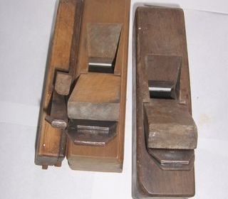 Lot de trois rabots en bois avec lame métallique, adaptés pour le travail du bois ou la menuiserie. L'ensemble comprend des outils en bois massif avec usure visible liée à une util