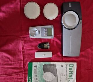 vends dispositif alarme maison sans fil de marque delta dore constitué d'une centrale avec sirène intérieure intégrée, 3 détecteurs de mouvement, un détecteur d'ouverture, un clavi