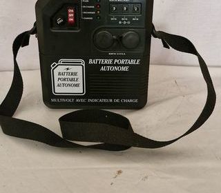 Batterie portable autonome avec poignée et lanière de transport Entrée : 14/15V Sortie : 3-6-9-12V câbles allume cigare Largeur 17cm profondeur 8cm hauteur 20cm Très bon éta