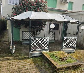 A vendre grande pagodes dimensions extérieur 500 cm de long sur 320 cm de large et 250 de haut .6 jardinières de fleurs et 3 luminaires globes . la toile du toit est à ch