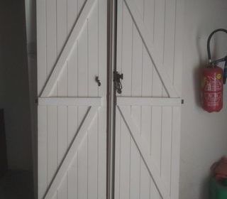 Volet bois (pin) 2 vantaux pour porte fenêtre Hauteur 227 cm (peut ce recouper) Largeur 120 cm (2 fois 60) Complet avec ferrure de fermeture et pentures Peint en blanc Bon ét