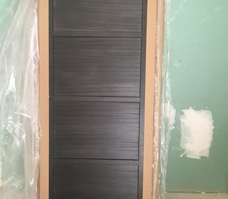 Porte pleine contemporaine 204 x 83 en bois exotique de Roziére, ouvrant Gauche. Modèle Rock Couleur gris graphite kit de finition d' habillage + poignée sans serrure. Ja