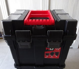 UN COFFRE A OUTILS PORTABLE MARQUE HD PATROL DE 2021 POIDS ENVIRON 4 KG MATIERE PLASTIQUE AVEC PETITS BACS POUR VISSERIE HAUTEUR TOTALE 65 CM LARGEUR 35 CM LONG 44 CM COMPRENAN