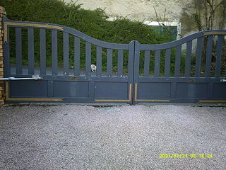 portail en bois d'iroko sans l'automatisme 2 ventaux de 2 m 30 soit 4 m 60 d'ouverture hauteur poteaux 1 m 50 au milieu 1 m 20 ; bon état