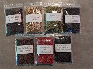 POIVRE DU MONDE 7 BAIES. plus de 300 grammes de baies fines pour les pros de la cuisine de restaurant. Poivre noir de Malabar + Poivre noir de Banasura + Poivre rouge bio entier +
