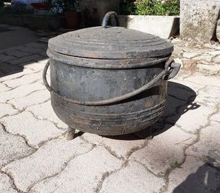 VDS CHAUDRON Ancien en Fonte Hauteur sans couvercle 29cm. Avec couvercle 40cm Diamètre 36cm A une anse pour pendaison sur une crémaillère. Il à 3 petits pieds Inscription 40 sur le