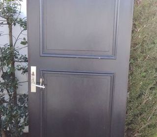 Bonne affaire porte en bois couleur chêne foncé avec serrure 5 clefs 3 points Dimensions Largeur 84cm hauteur 2m12 État satisfaisant