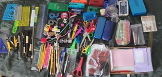 Crayons de couleur, stylos, feutres, ciseaux, compas, rapporteurs, trousses, bâtons de colle, rubans adhésifs, gommes... pas de réservation paiement en espèces lors de l'achat