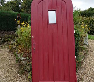 Porte d'entrée de maison en bon état, belle allure avec son arrondi en arceau et sa petite vitre miroir sans tain permettant de voir à l'extérieur sans être vu. Dimens