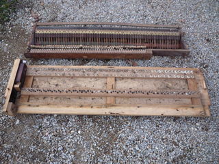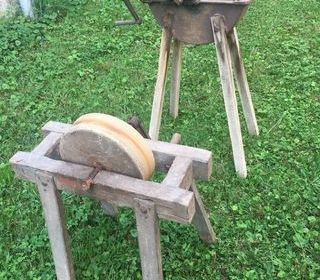 Ancienne meule en pierre à eau sur cadre/médiéval diamètre 27cm x 7cm 38cm x 8cm 35cm x 5,5cm cadre fer / base 76cm x 40cm 65€ pièce
