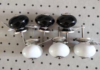 En porcelaine et en très bon état. Diamètre 40 mm et 3 cm de tige filetée. Noir et blanc. Avec étiquette. Bon bricolage.