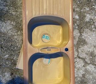 Evier 2 bacs en résine Dimensions : longueur 116 largeur 50 profondeur des bacs 21 Un repose éponges au milieu En excellent état Possibilité livraison en fonction du lieu