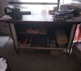 Etabli plateau bois 1.39 x 0.73 hauteur 0.9 sur chassis métal livré avec étau à base tournante et perceuse bosch sur colonne de 45 cm et son étau de maintien a enlever rapidement