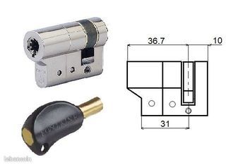 Cylindre de serrure (neuf) en métal argenté avec deux clés. Le cylindre possède des finitions chromées et est accompagné deux clés à tête noire. Idéal pour une installation sur une