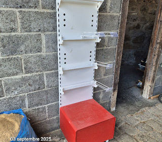 Présentoir en métal sur roulettes, avec crochets et réserve présentoir neuf Profondeur 48 cm, largeur 50 cm, hauteur 1.66 mètre Il ya 4 barres pour crochets et