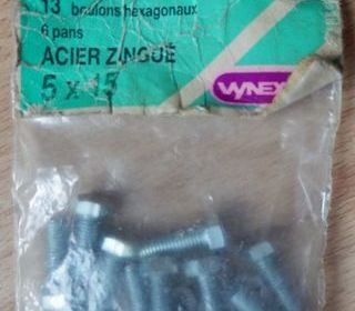 Vend : Sachet de 13 Boulons tête hexagonale 6 pans Forme de la tête: hexagonale 6 pans Diamètre : 5 mm Longueur : 16 mm Matière : acier zingué Quantité : 13 boulo