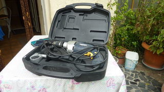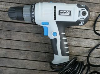 Perceuse filaire MacAllister MSCD300 dans son sac à poignets tissu zipé, avec la notice et 2 boîtes de forets, 1 pour le métal (fer acier inox, cuivre, fonte, aluminium et zinc), 1