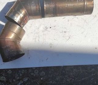 lot de conduits de fumée inox d. 150 mm 2 coudes de 45° dia. 150 (valeur neuf 43,00 x 2 = 86,00 €). 1 rallonge dia. 150 L 330 mm (valeur neuf 36,00€). Je vends uniquement le lot