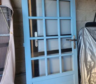 Porte bleue vitrée en bon état. Avec joli poignet couleur inox argenté avec un loquet. Les dimensions sont marquées sur les photos.