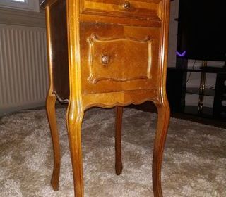 Magnifique table de chevet en bois massif d'époque début XXième Dimensions : 36 x 36 x 80 Dessus en dallage imitation marbre Intérieur en porcelaine taillée en arrondi (pour héb