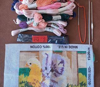 lot de matériel articles de broderie 2 crochets: 2.00 et 2 1/2 1 pince à nourrice 1 canevas 25 retors n°4 à broder en coton pour tapisserie 10 mètres marque DMC restes