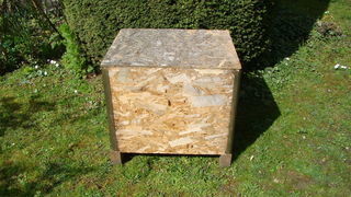 Caisse de transport / stockage en bois OSB Caisse d'expédition avec couvercle utilisée pour le stockage ou le transport. Caisse avec rehausse à la base et charnières métalliques