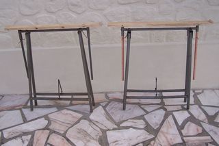 2 Tréteaux d'atelier pliables et réglables dans différentes positions- Haut. mini:79cm- Maxi:1m17 -Avec plateaux en bois de 83cm.