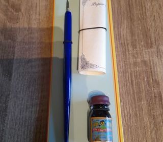 "Ecrire à l'encre", de la marque originale J. HERBIN, ensemble composé de : - 1 porte-plume, - 1 plume, - 1 flacon d'encre violette, - 1 buvard. Excellent état car jamais