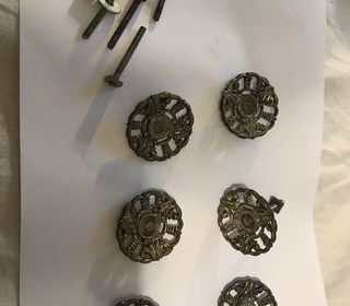 Six tirettes de tiroir décoratives en laiton Manque un écrou sur une tirette Prix: 20 euro Soit 3,33 euro pièce
