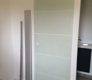Porte coulisante en verre trempé. parfait état. Complet avec rail.