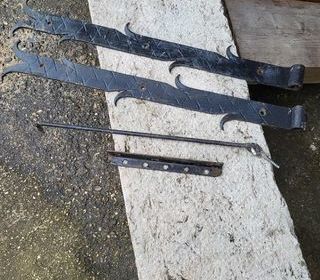 32 pentures à volets queues de carpes percées 2€ / pièces longueur 530 extrémité/ axe trou diamètre 14mm 16 crochets à crémaillères 1€/ pièces 16 crémaillères pour crochets 1€/ p